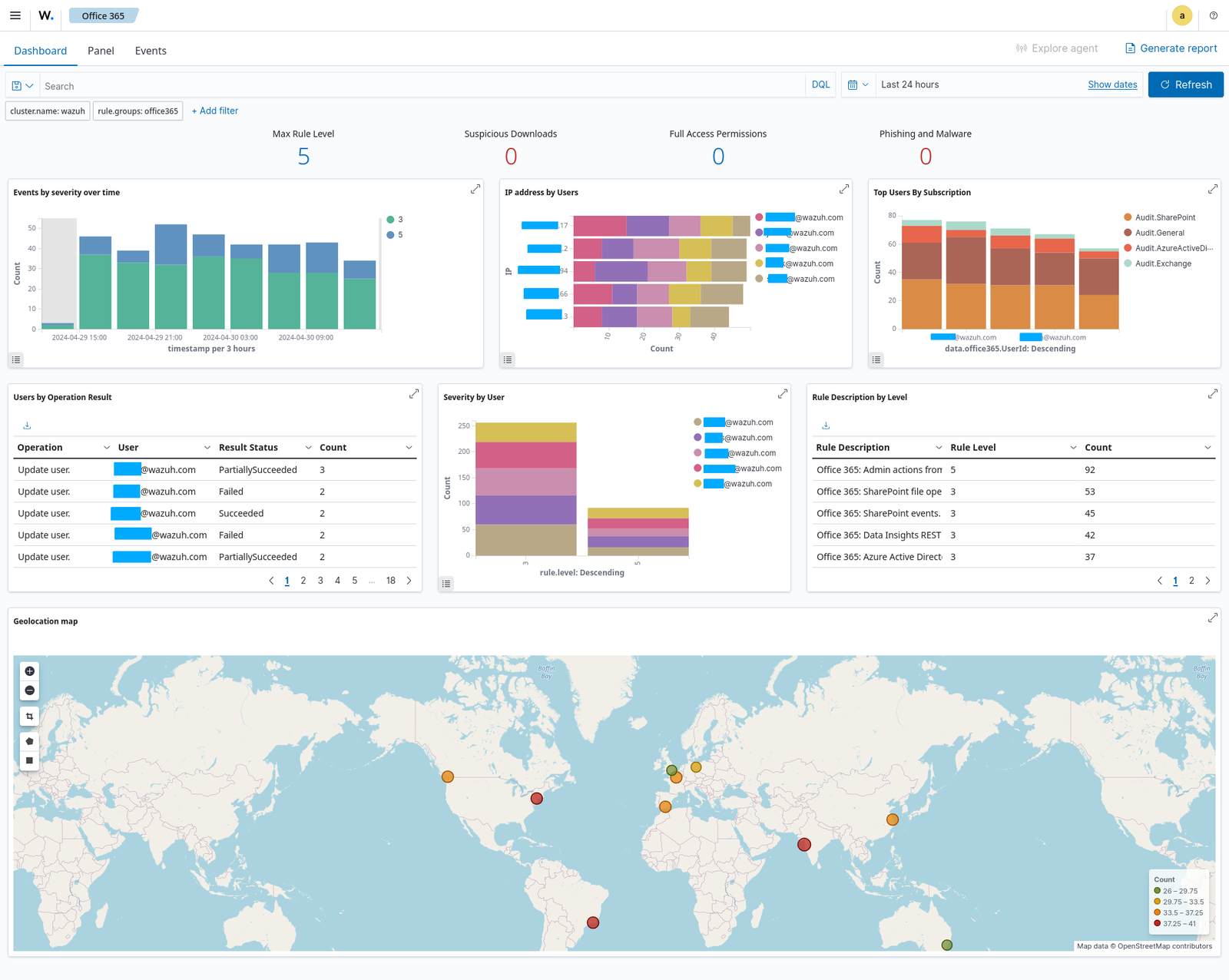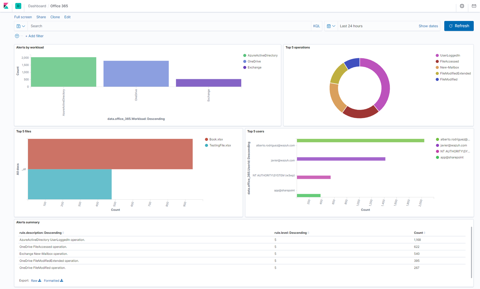 évènements Office 365, regroupés par charge de travail et type d’opération