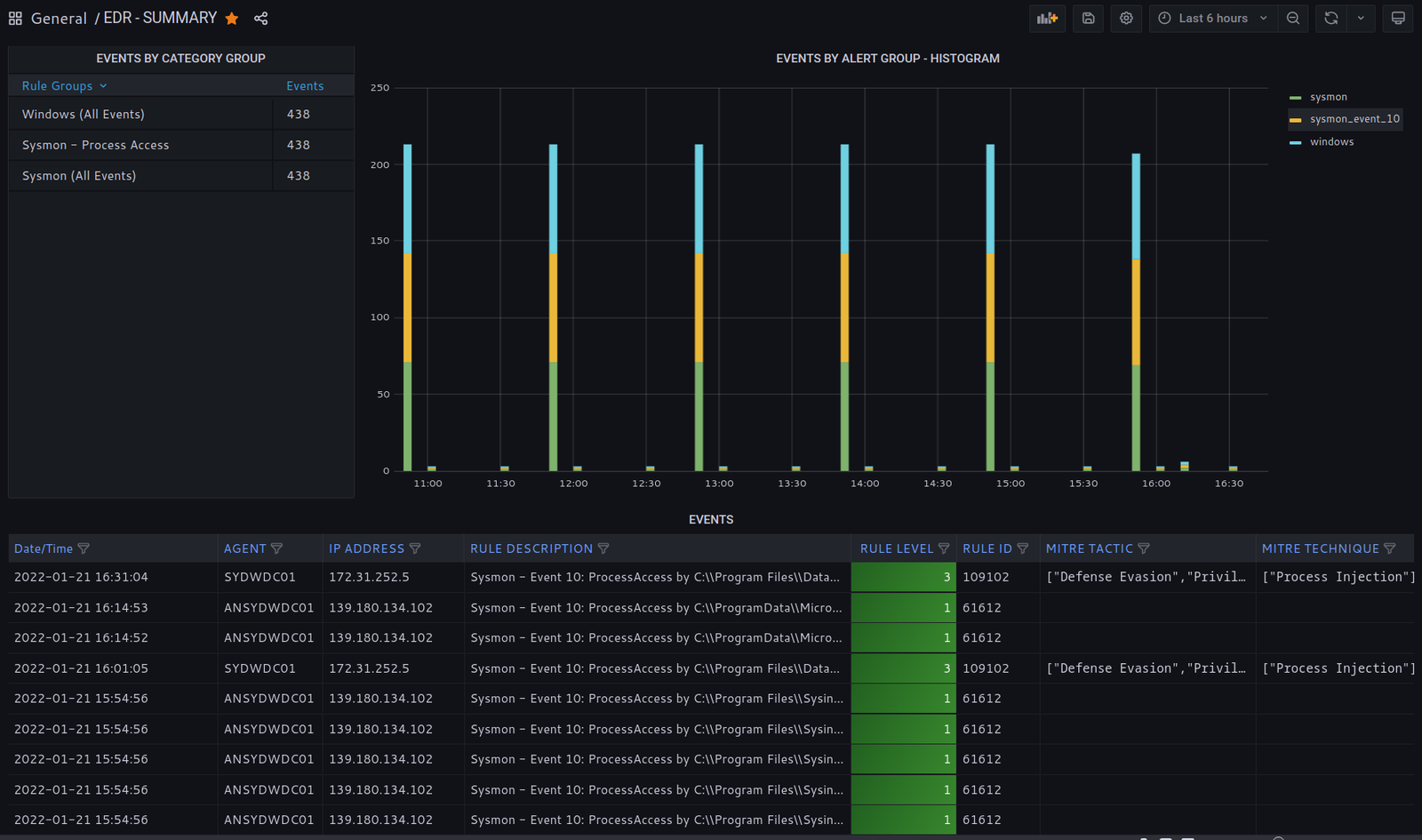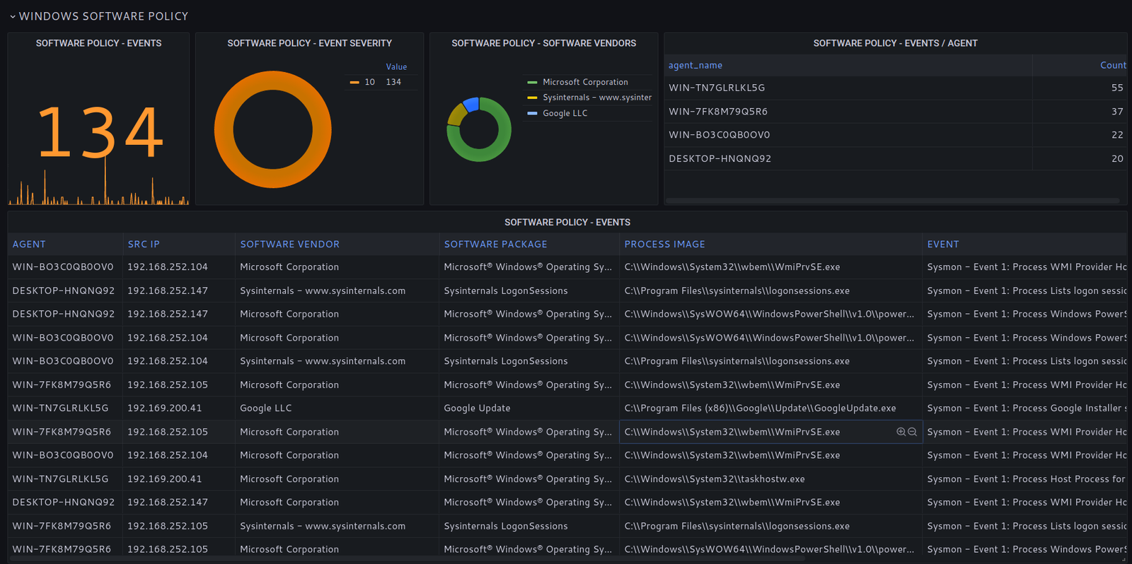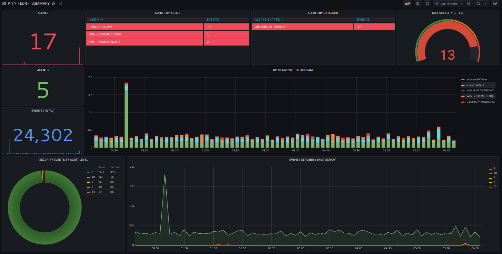 Chaque tableau de bord combine des résumés et des données agrégées pour donner une vue d’ensemble rapide des évènements et des règles de détection.